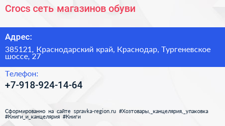 Crocs, сеть магазинов обуви по адресу 385121, Краснодарский край, Краснодар, Тургеневское шоссе, 27 в дальнейшем Организация, размещена в следующих категориях: