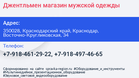 Джентльмен, магазин мужской одежды по адресу 350028, Краснодарский край, Краснодар, Восточно-Кругликовская, 34 в дальнейшем Организация, размещена в следующих категориях: