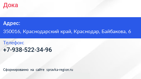 Дока+ по адресу 350016, Краснодарский край, Краснодар, Байбакова, 6 в дальнейшем Организация, размещена в следующих категориях: