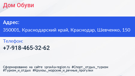 Дом Обуви по адресу 350001, Краснодарский край, Краснодар, Шевченко, 150 в дальнейшем Организация, размещена в следующих категориях: