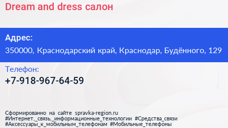 Dream and dress, салон по адресу 350000, Краснодарский край, Краснодар, Будённого, 129 в дальнейшем Организация, размещена в следующих категориях: