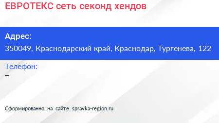 ЕВРОТЕКС, сеть секонд-хендов по адресу 350049, Краснодарский край, Краснодар, Тургенева, 122 в дальнейшем Организация, размещена в следующих категориях: