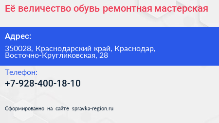 Её величество обувь, ремонтная мастерская по адресу 350028, Краснодарский край, Краснодар, Восточно-Кругликовская, 28 в дальнейшем Организация, размещена в следующих категориях: