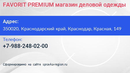 FAVORIT PREMIUM, магазин деловой одежды по адресу 350020, Краснодарский край, Краснодар, Красная, 149 в дальнейшем Организация, размещена в следующих категориях: