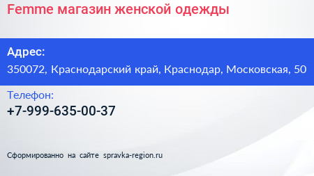 Femme, магазин женской одежды по адресу 350072, Краснодарский край, Краснодар, Московская, 50 в дальнейшем Организация, размещена в следующих категориях:
