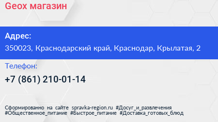 Geox, магазин по адресу 350023, Краснодарский край, Краснодар, Крылатая, 2 в дальнейшем Организация, размещена в следующих категориях: