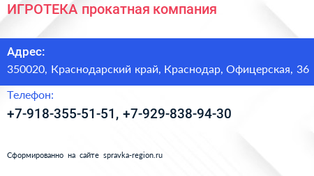 ИГРОТЕКА, прокатная компания по адресу 350020, Краснодарский край, Краснодар, Офицерская, 36 в дальнейшем Организация, размещена в следующих категориях:
