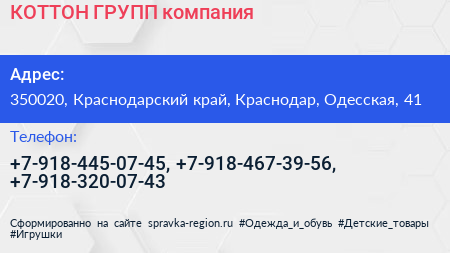 КОТТОН-ГРУПП, компания по адресу 350020, Краснодарский край, Краснодар, Одесская, 41 в дальнейшем Организация, размещена в следующих категориях: