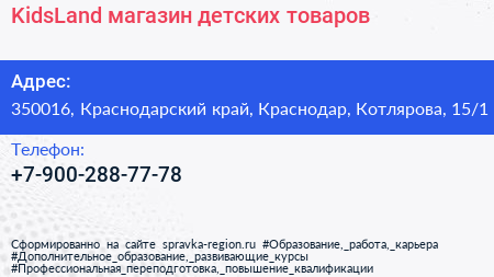 KidsLand, магазин детских товаров по адресу 350016, Краснодарский край, Краснодар, Котлярова, 15/1 в дальнейшем Организация, размещена в следующих категориях: