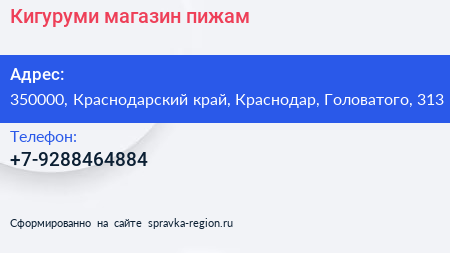 Кигуруми, магазин пижам по адресу 350000, Краснодарский край, Краснодар, Головатого, 313 в дальнейшем Организация, размещена в следующих категориях: