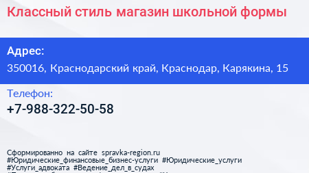 Классный стиль, магазин школьной формы по адресу 350016, Краснодарский край, Краснодар, Карякина, 15 в дальнейшем Организация, размещена в следующих категориях: