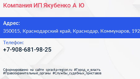 Компания, ИП Якубенко А.Ю. по адресу 350015, Краснодарский край, Краснодар, Коммунаров, 192 в дальнейшем Организация, размещена в следующих категориях: