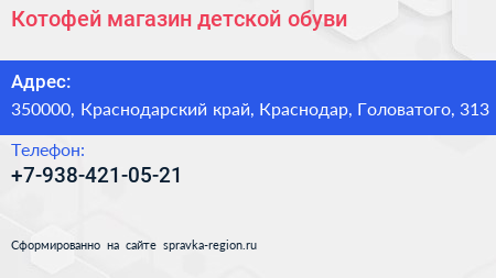 Котофей, магазин детской обуви по адресу 350000, Краснодарский край, Краснодар, Головатого, 313 в дальнейшем Организация, размещена в следующих категориях: