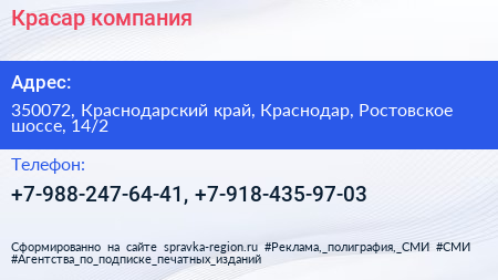 Красар, компания по адресу 350072, Краснодарский край, Краснодар, Ростовское шоссе, 14/2 в дальнейшем Организация, размещена в следующих категориях: