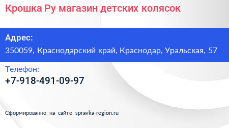 Крошка Ру, магазин детских колясок по адресу 350059, Краснодарский край, Краснодар, Уральская, 57 в дальнейшем Организация, размещена в следующих категориях: