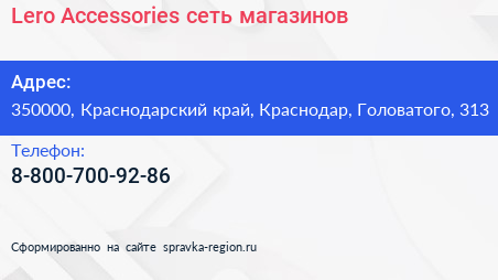 Lero Accessories, сеть магазинов по адресу 350000, Краснодарский край, Краснодар, Головатого, 313 в дальнейшем Организация, размещена в следующих категориях:
