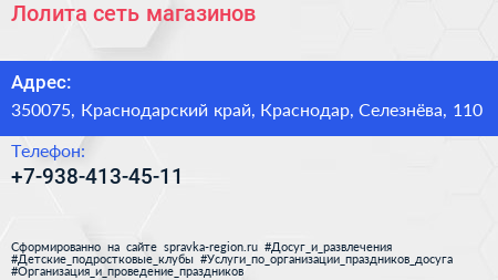 Лолита, сеть магазинов по адресу 350075, Краснодарский край, Краснодар, Селезнёва, 110 в дальнейшем Организация, размещена в следующих категориях: