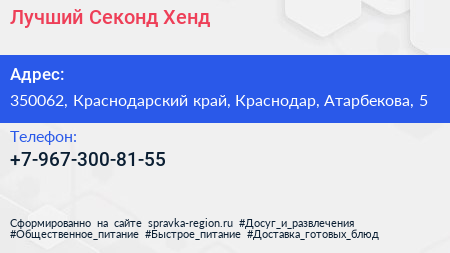 Лучший Секонд-Хенд по адресу 350062, Краснодарский край, Краснодар, Атарбекова, 5 в дальнейшем Организация, размещена в следующих категориях: