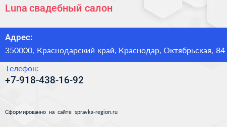 Luna, свадебный салон по адресу 350000, Краснодарский край, Краснодар, Октябрьская, 84 в дальнейшем Организация, размещена в следующих категориях: