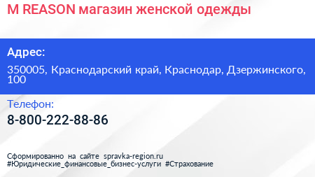 M.REASON, магазин женской одежды по адресу 350005, Краснодарский край, Краснодар, Дзержинского, 100 в дальнейшем Организация, размещена в следующих категориях: