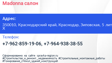 Madonna, салон по адресу 350010, Краснодарский край, Краснодар, Зиповская, 5 лит Х в дальнейшем Организация, размещена в следующих категориях:
