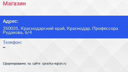 Магазин по адресу 350031, Краснодарский край, Краснодар, Профессора Рудакова, 6/4 в дальнейшем Организация, размещена в следующих категориях: