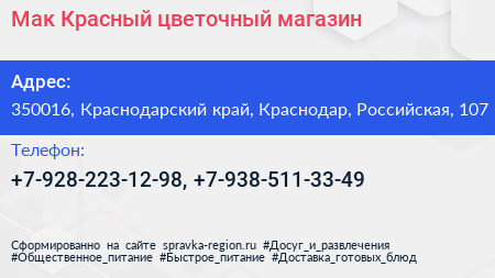 Мак Красный, цветочный магазин по адресу 350016, Краснодарский край, Краснодар, Российская, 107 в дальнейшем Организация, размещена в следующих категориях: