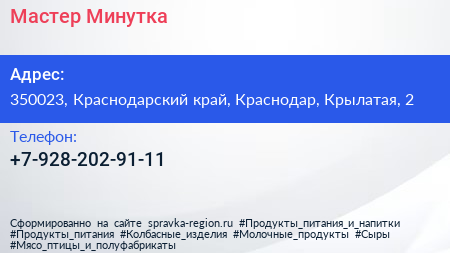 Мастер Минутка по адресу 350023, Краснодарский край, Краснодар, Крылатая, 2 в дальнейшем Организация, размещена в следующих категориях:
