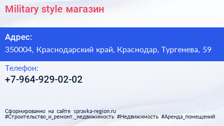 Military style, магазин по адресу 350004, Краснодарский край, Краснодар, Тургенева, 59 в дальнейшем Организация, размещена в следующих категориях: