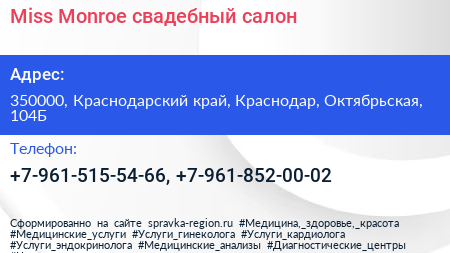 Miss Monroe, свадебный салон по адресу 350000, Краснодарский край, Краснодар, Октябрьская, 104Б в дальнейшем Организация, размещена в следующих категориях: