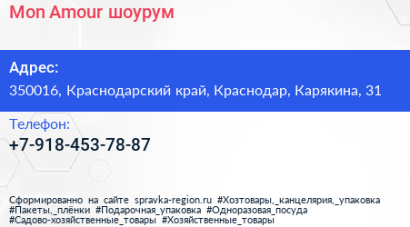 Mon Amour, шоурум по адресу 350016, Краснодарский край, Краснодар, Карякина, 31 в дальнейшем Организация, размещена в следующих категориях: