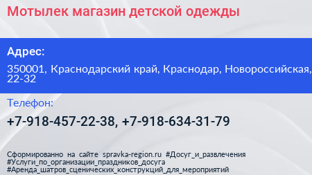 Мотылек, магазин детской одежды по адресу 350001, Краснодарский край, Краснодар, Новороссийская, 22-32 в дальнейшем Организация, размещена в следующих категориях: