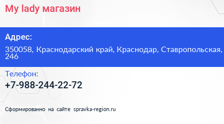My lady, магазин по адресу 350058, Краснодарский край, Краснодар, Ставропольская, 246 в дальнейшем Организация, размещена в следующих категориях: