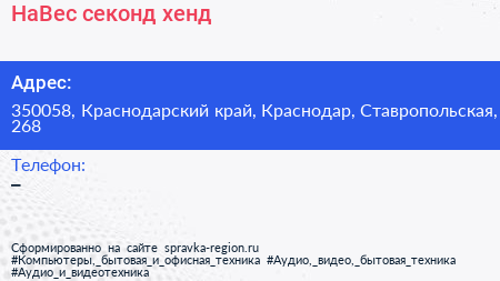 НаВес, секонд-хенд по адресу 350058, Краснодарский край, Краснодар, Ставропольская, 268 в дальнейшем Организация, размещена в следующих категориях:
