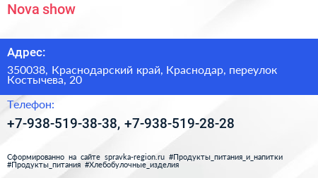 Nova show по адресу 350038, Краснодарский край, Краснодар, переулок Костычева, 20 в дальнейшем Организация, размещена в следующих категориях: