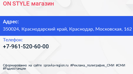 ON STYLE, магазин по адресу 350024, Краснодарский край, Краснодар, Московская, 162 в дальнейшем Организация, размещена в следующих категориях: