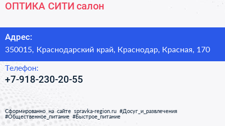 ОПТИКА СИТИ, салон по адресу 350015, Краснодарский край, Краснодар, Красная, 170 в дальнейшем Организация, размещена в следующих категориях: