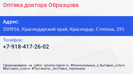 Оптика доктора Образцова по адресу 350916, Краснодарский край, Краснодар, Степная, 291 в дальнейшем Организация, размещена в следующих категориях: