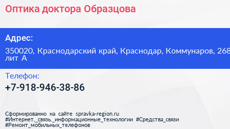 Оптика доктора Образцова по адресу 350020, Краснодарский край, Краснодар, Коммунаров, 268 лит А в дальнейшем Организация, размещена в следующих категориях: