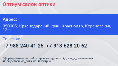 Оптиум, салон оптики по адресу 350005, Краснодарский край, Краснодар, Кореновская, 12ж в дальнейшем Организация, размещена в следующих категориях: