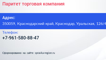 Паритет, торговая компания по адресу 350059, Краснодарский край, Краснодар, Уральская, 126/4 в дальнейшем Организация, размещена в следующих категориях: