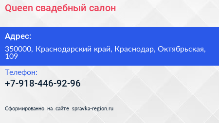 Queen, свадебный салон по адресу 350000, Краснодарский край, Краснодар, Октябрьская, 109 в дальнейшем Организация, размещена в следующих категориях: