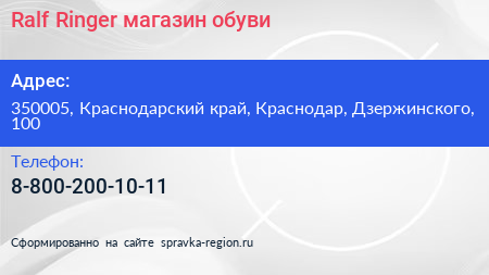 Ralf Ringer, магазин обуви по адресу 350005, Краснодарский край, Краснодар, Дзержинского, 100 в дальнейшем Организация, размещена в следующих категориях: