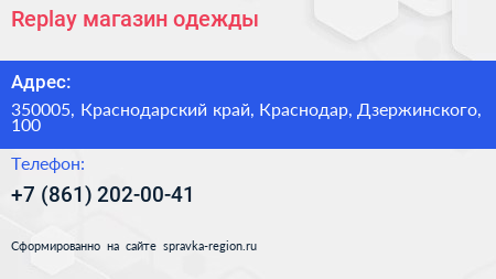 Replay, магазин одежды по адресу 350005, Краснодарский край, Краснодар, Дзержинского, 100 в дальнейшем Организация, размещена в следующих категориях:
