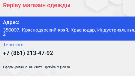 Replay, магазин одежды по адресу 350007, Краснодарский край, Краснодар, Индустриальная, 2 в дальнейшем Организация, размещена в следующих категориях:
