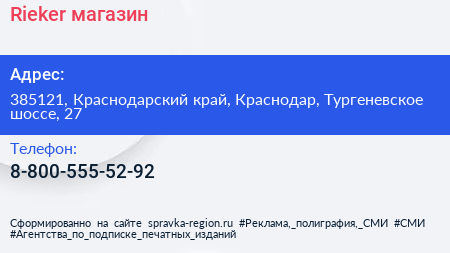 Rieker, магазин по адресу 385121, Краснодарский край, Краснодар, Тургеневское шоссе, 27 в дальнейшем Организация, размещена в следующих категориях: