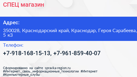 СПЕЦ, магазин по адресу 350028, Краснодарский край, Краснодар, Героя Сарабеева, 5 к3 в дальнейшем Организация, размещена в следующих категориях: