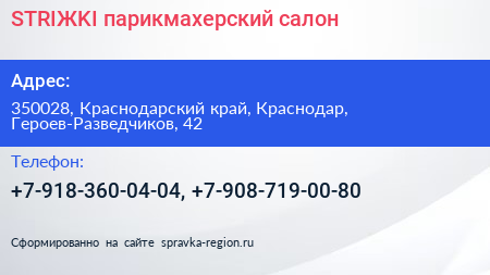 STRIЖKI, парикмахерский салон по адресу 350028, Краснодарский край, Краснодар, Героев-Разведчиков, 42 в дальнейшем Организация, размещена в следующих категориях: