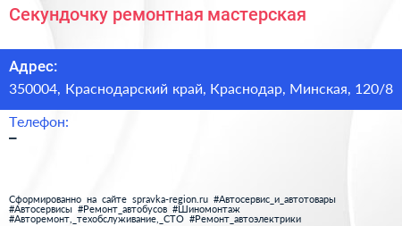 Секундочку, ремонтная мастерская по адресу 350004, Краснодарский край, Краснодар, Минская, 120/8 в дальнейшем Организация, размещена в следующих категориях: