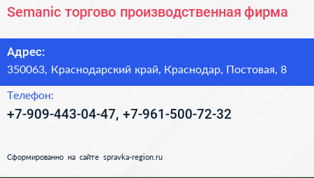 Semanic, торгово-производственная фирма по адресу 350063, Краснодарский край, Краснодар, Постовая, 8 в дальнейшем Организация, размещена в следующих категориях: